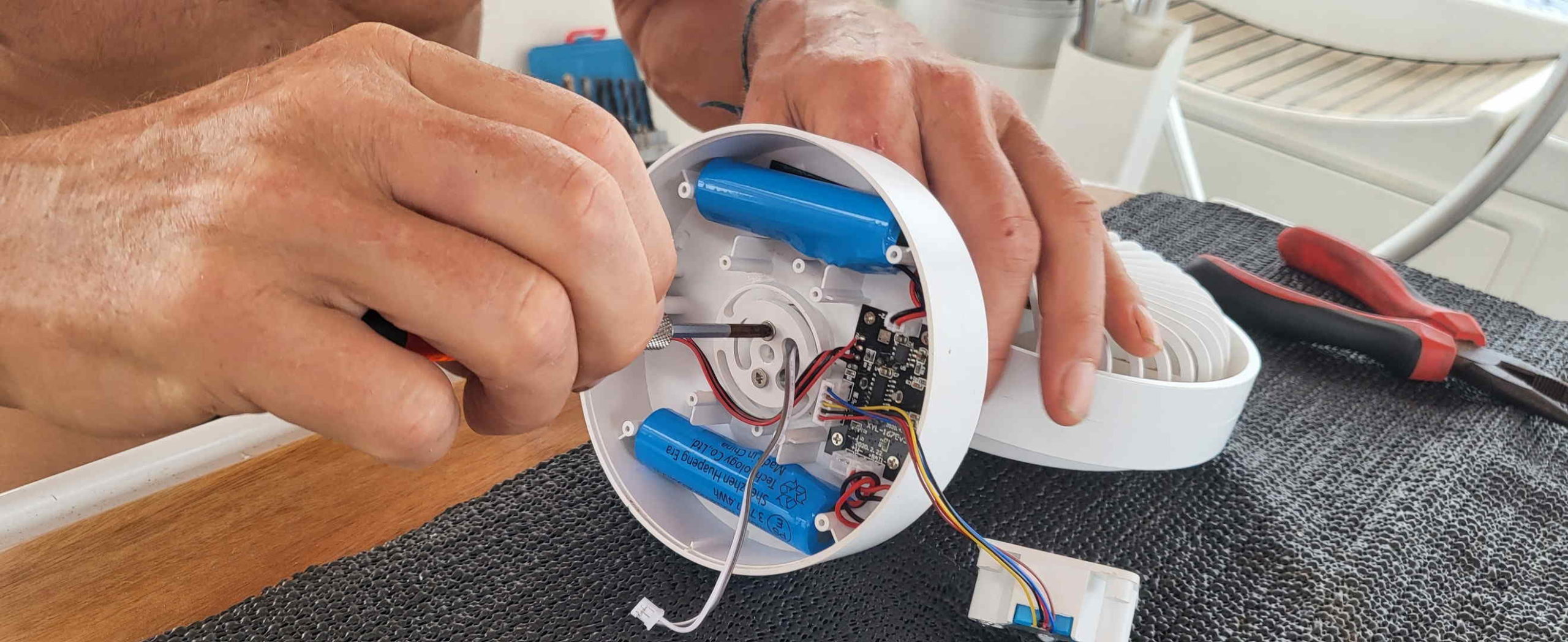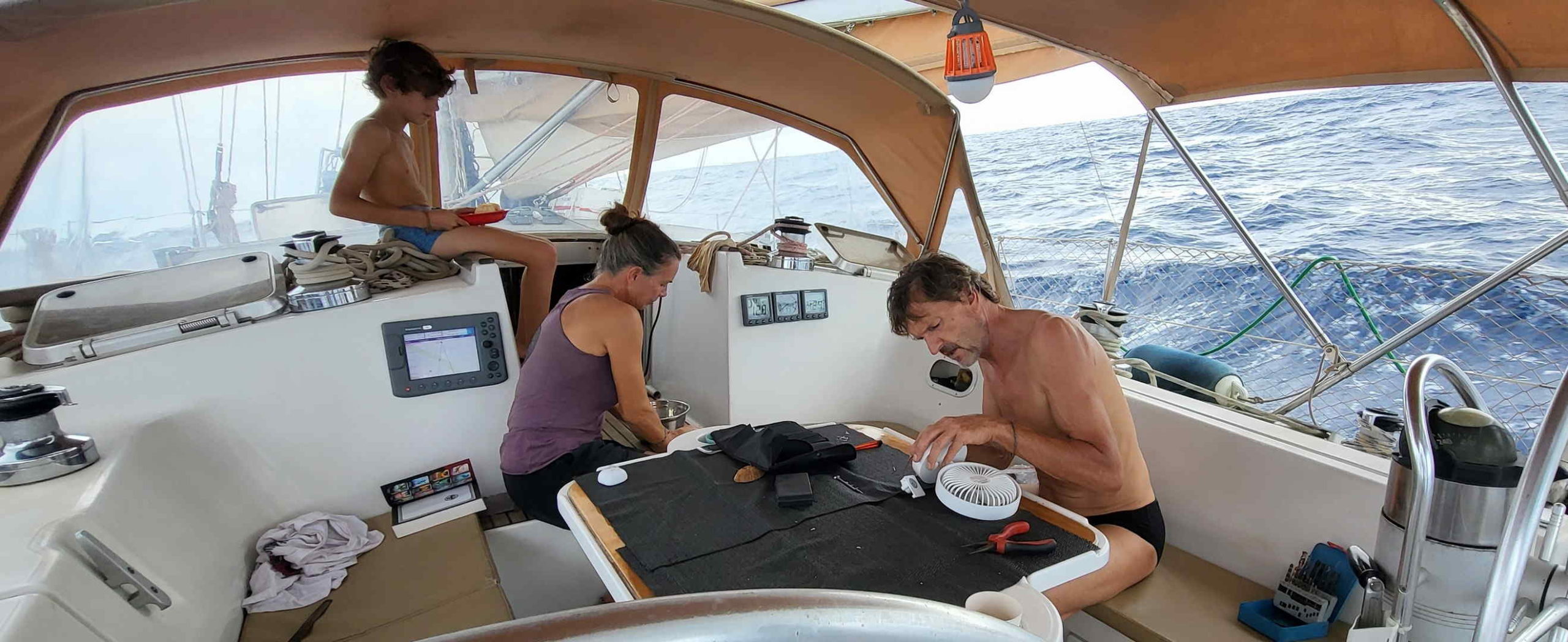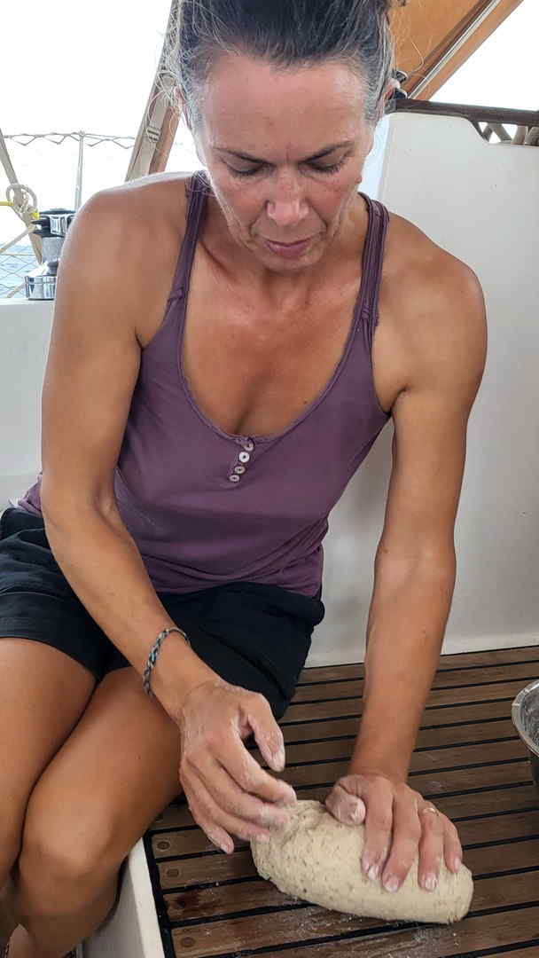 17h20 : Jean-Luc s’occupe de réparer les ventilateurs qui se sont cassés en tombant des étagères des garçons lors d’un gros coup de gîte. On en aura besoin, on sent les températures qui augmentent! Je fais du pain.