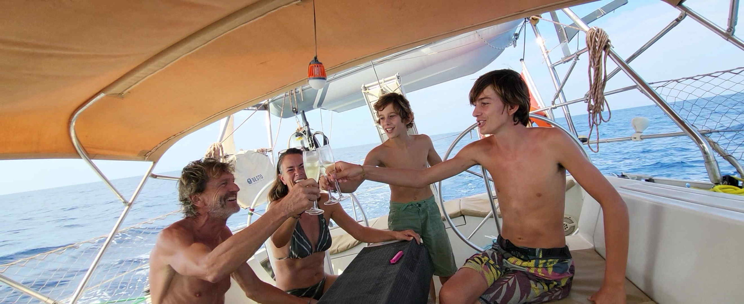 16h20 : Passage de l’équateur ! Nous ouvrons une bouteille de champagne que nous avons achetée pour l’occasion à Auchan Dakar. Les garçons se joignent à nous et y goûtent pour la première fois. Nous n’oublions pas de sacrifier un demi-verre par-dessus bord (il ne faut pas exagérer!…) à Poséidon ou Neptune ou à qui voudra bien faire la fête avec nous 😉.