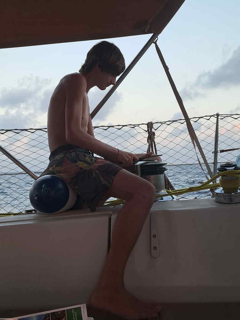 Le bateau bouge trop à l’intérieur et il y a trop de vent à l’extérieur ; difficile pour les garçons de faire beaucoup de travail scolaire. Nous sommes également contents d’avoir pré-cuisiné quelques repas avant de quitter Mindelo : ce soir, ce sera un curry jaune thaï .